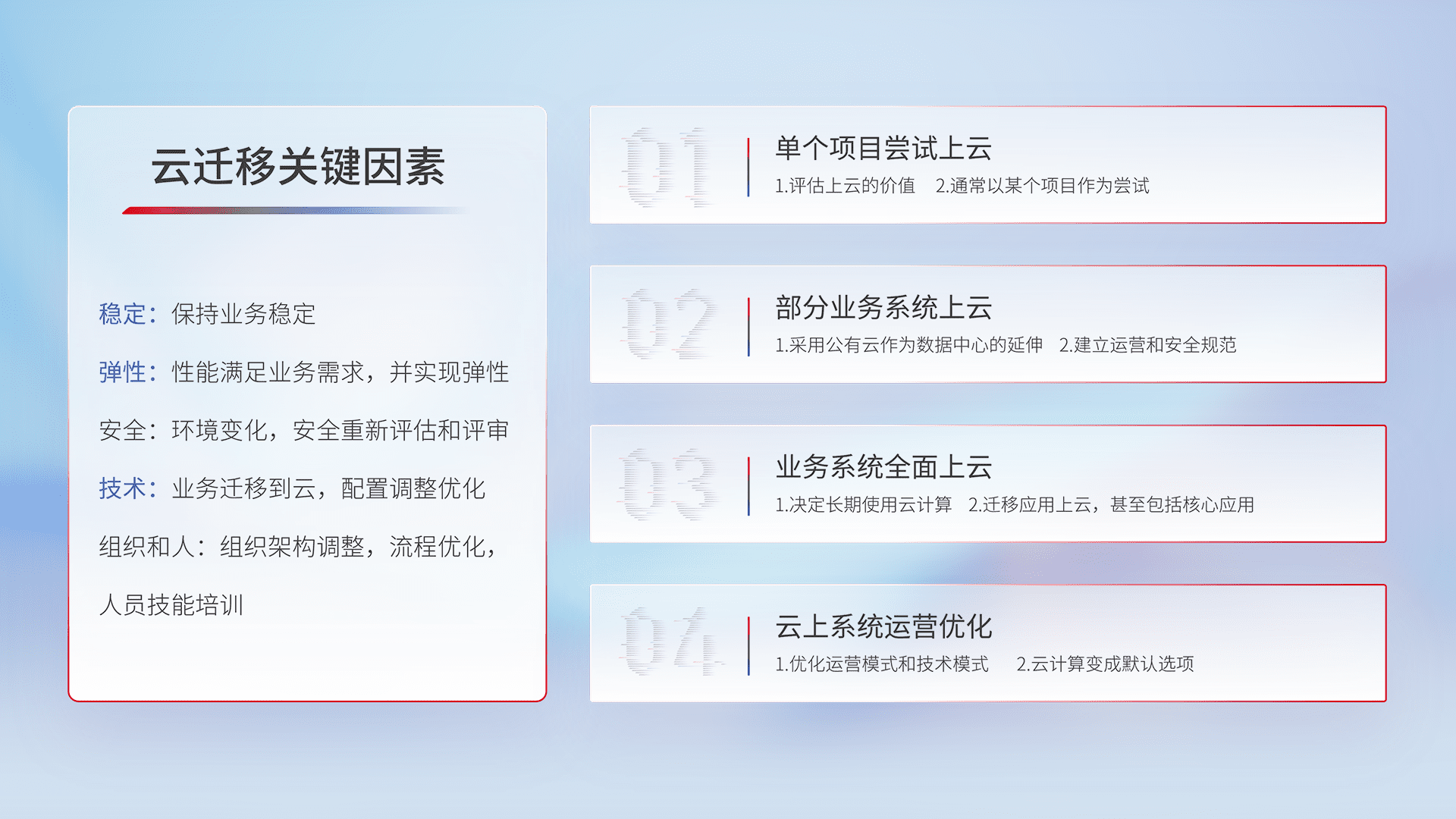 结合实际业务,,,,从规划设计、、、、云平台选型、、云原生改造、、数据迁移、、、集成交付,,,迁移全过程为客户识别最佳上云路径,,做好风险识别管理,,,,设计网络架构、、身份权限、、安全审计合规、、、、操作审计、、、、日志审计、、、、监控告警策略、、、、多站点容灾设计等,,,对云上基础设施进行整体规划,,提升IT治理水平,,,以满足弹性、、高可用、、、高性能的需求。。